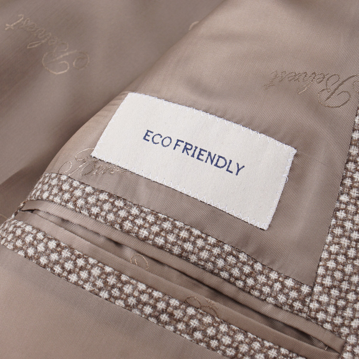 Soft-woven wool-blend fabric in a light brown and cream birdseye pattern.  96% wool, 4% cashmere.  Mid weight.