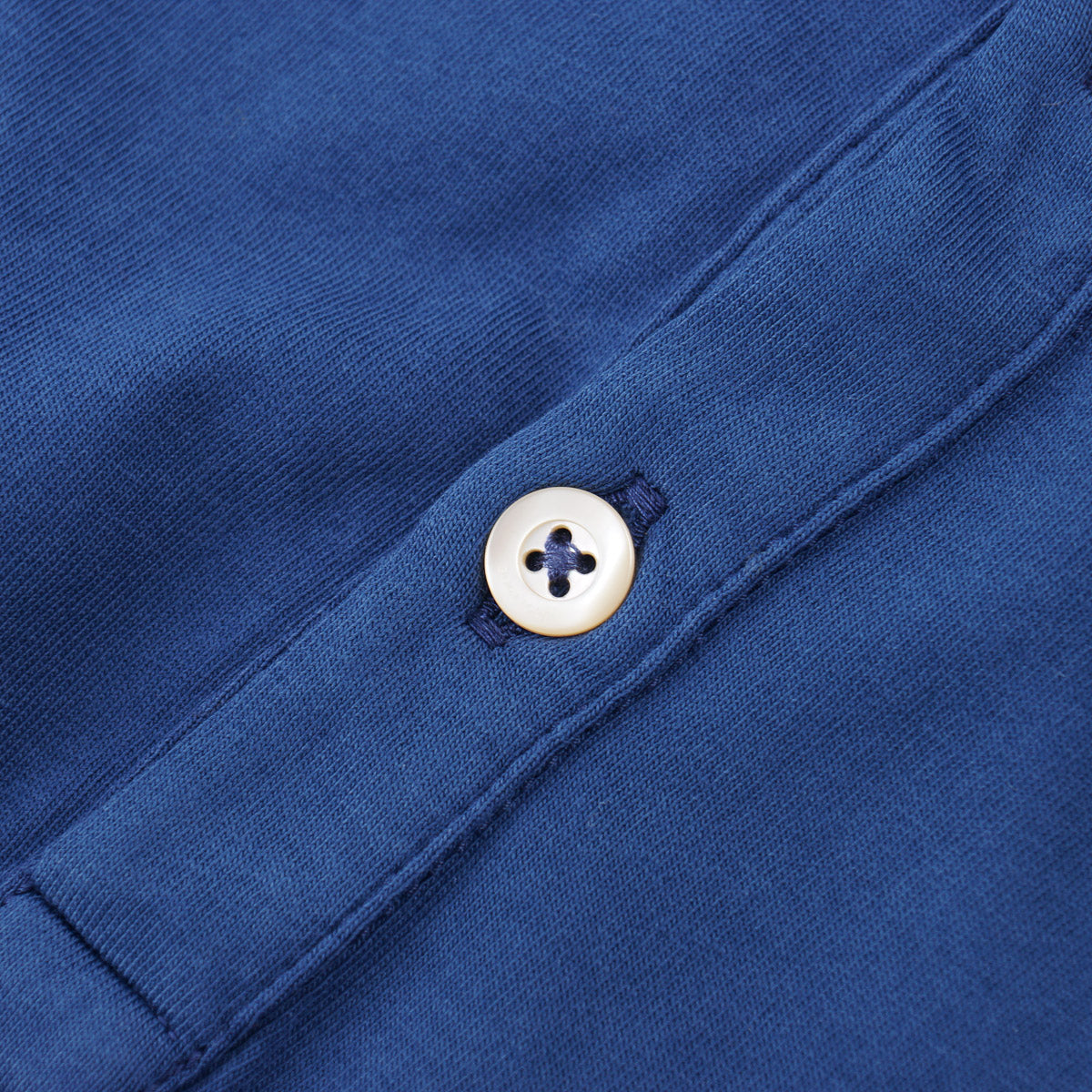 Blue garment-dyed extrafine knit jersey cotton fabric with mother-of-pearl buttons. Mid-light weight. 100% cotton.