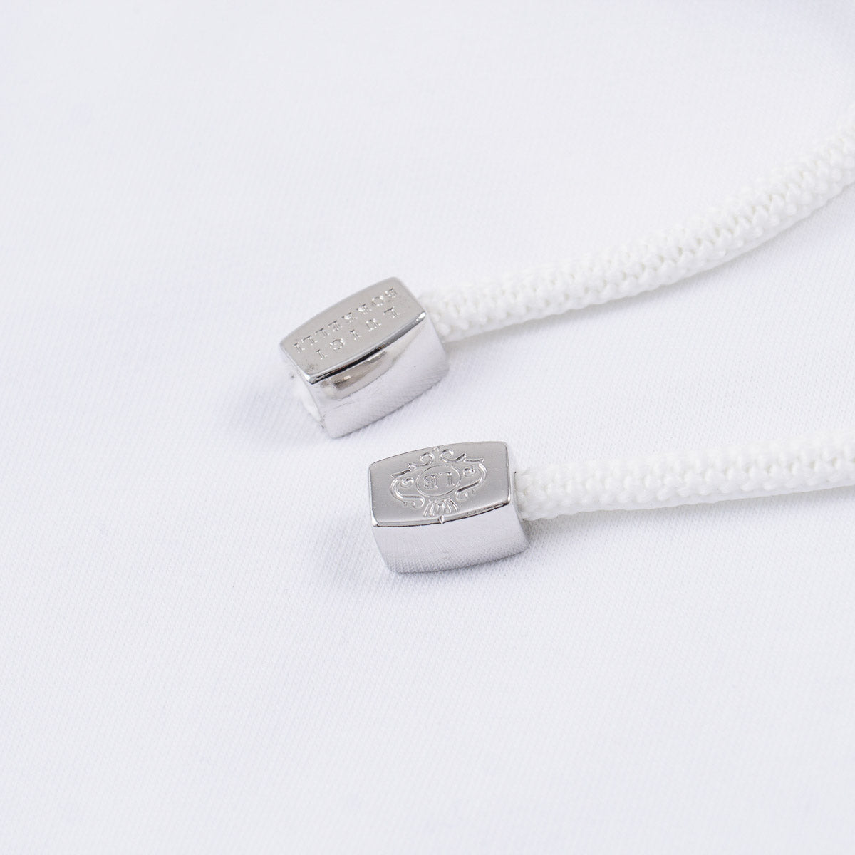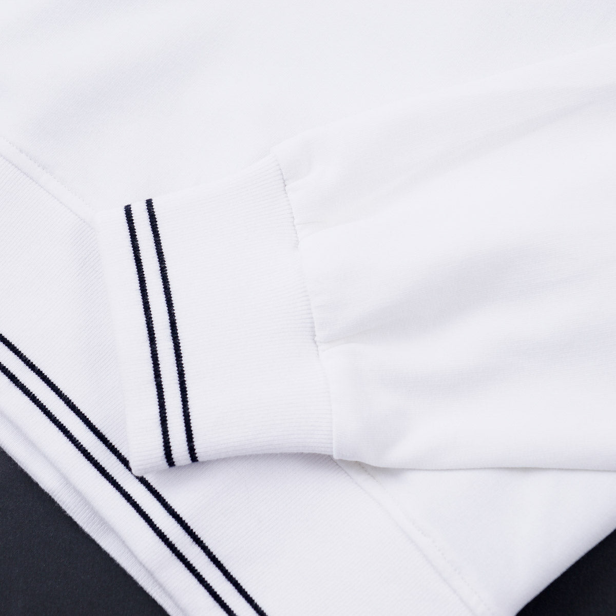 White soft knit jersey cotton fabric with contrasting dark navy blue details. 95% cotton, 5% elastane. Mid weight