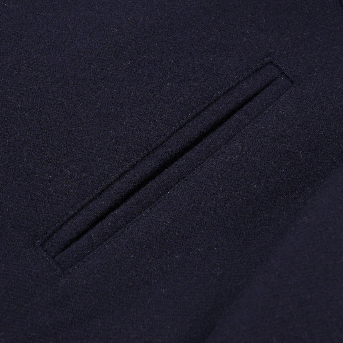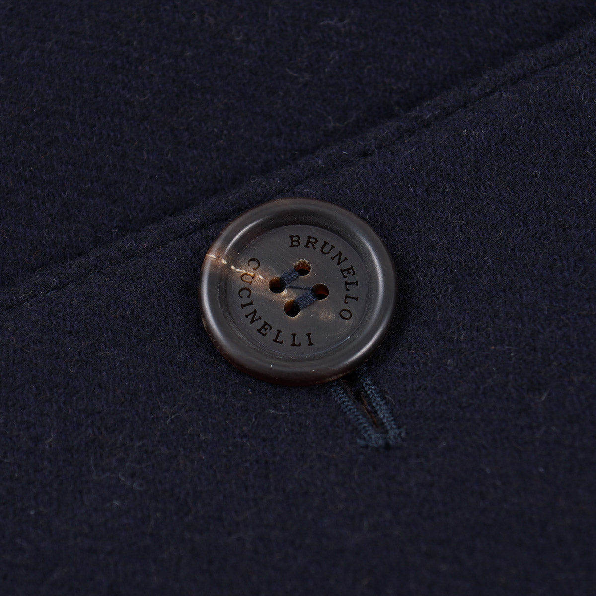 Navy blue brushed flannel wool fabric; double-faced, with cocoa brown on the interior side. Fall-winter weight. 100% wool.