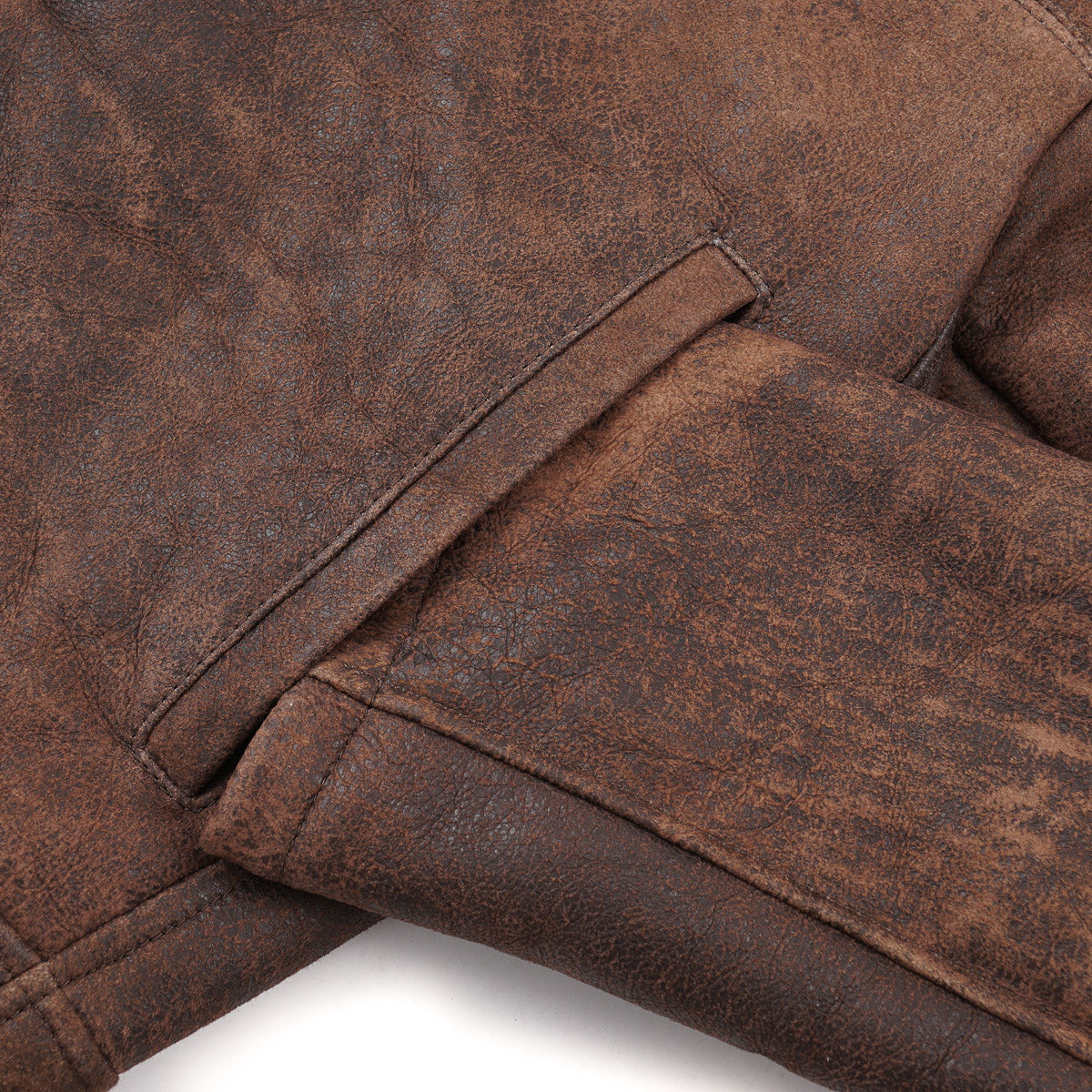 Brown vintage-effect leather exterior with cream-colored extra-soft plush sheepskin shearling fur lining. 100% shearling leather. Winter weight.