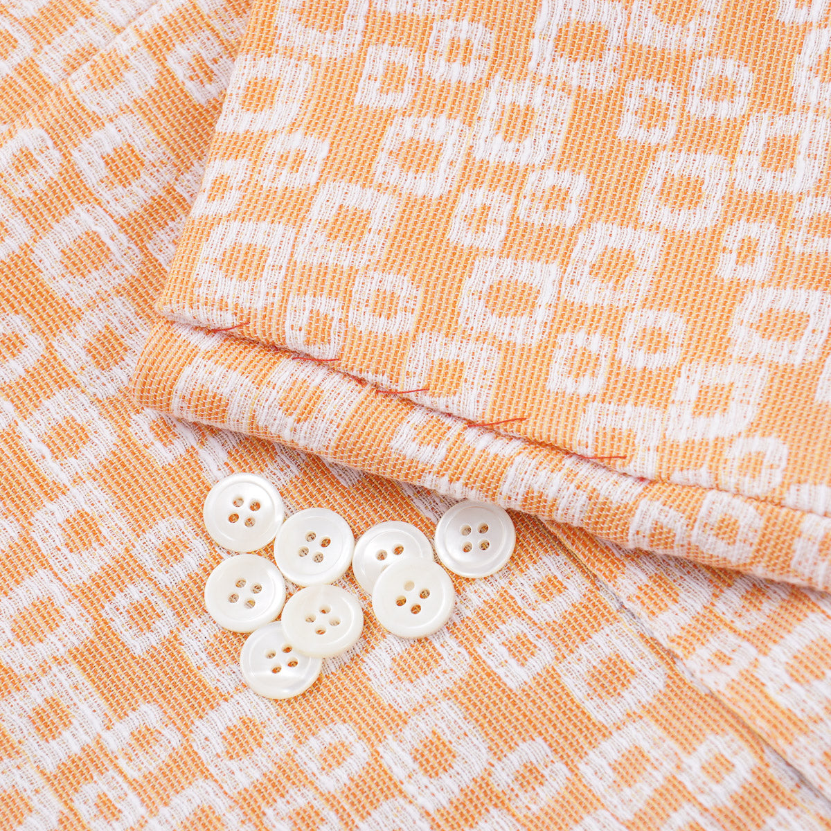 Sherbet orange and white geometric mod printed cotton-linen fabric.  74% cotton, 26% linen.  Mid weight.