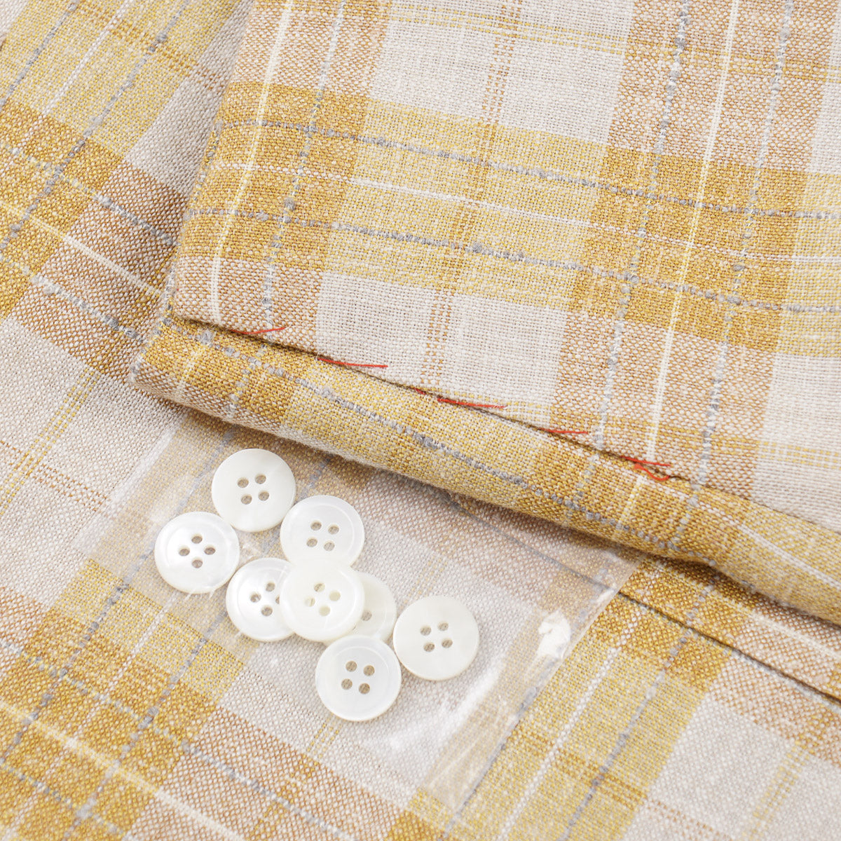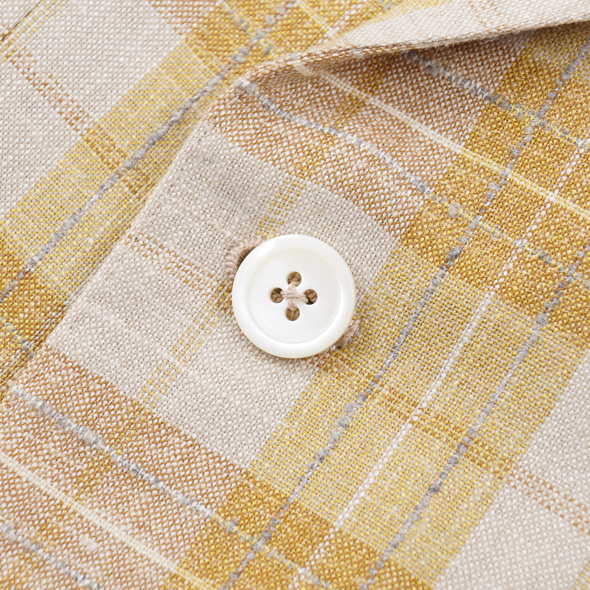 Golden yellow, cream, and slate gray woven check Dandy Attitude fabric.  38% wool, 34% silk, 28% linen.  Mid weight.