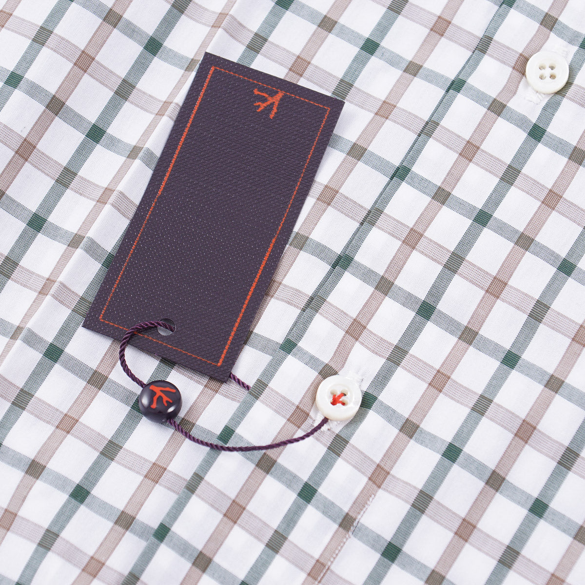 White extrafine cotton fabric with green and brown check pattern. 100% cotton. Lighter weight.