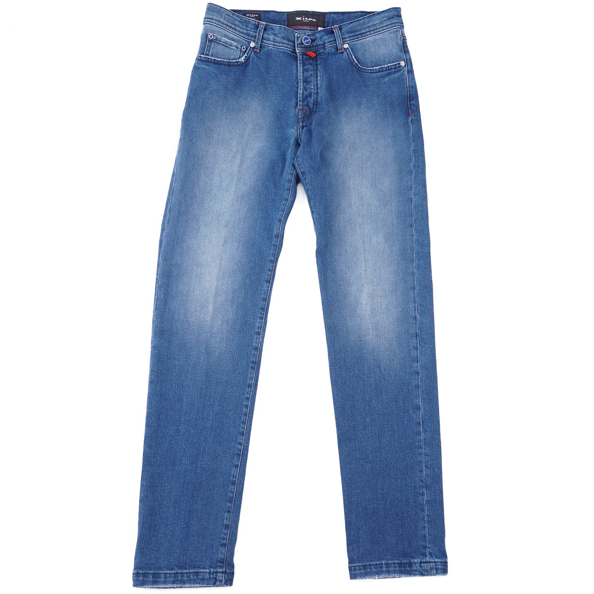 Medium blue soft sanded stretch denim fabric. Mid weight. 98% cotton, 2% elastane.