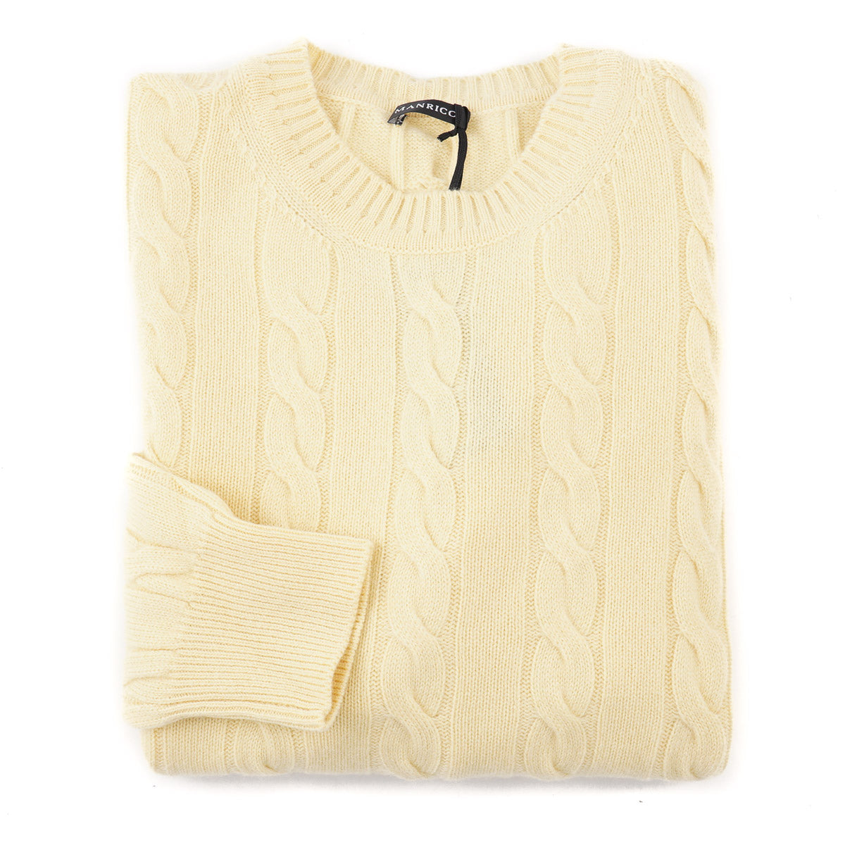 Light butter yellow colored extra-soft cashmere fabric in a cable knit design. Fall and winter weight. 100% cashmere.