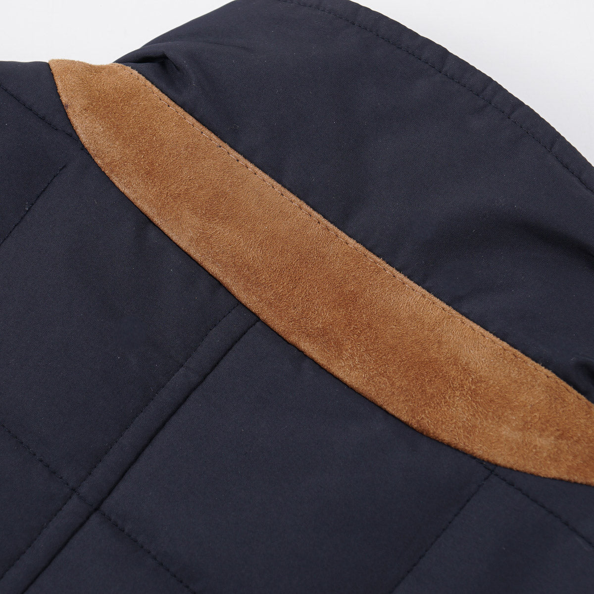 Navy blue quilted microfiber shell with knit wool sleeves. Contrasting lambskin suede leather accents. 100% polyester; 100% wool knit. Mid-weight