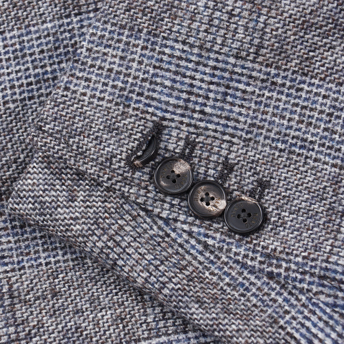 Gray and blue check patterned soft-woven cashmere fabric. Detachable lightly insulated gilet. 100% cashmere. Mid-weight