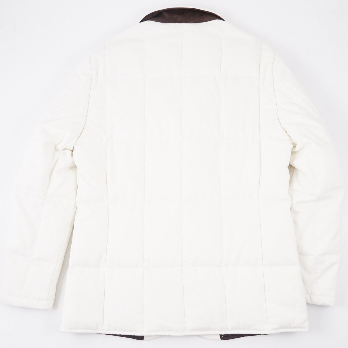 Ivory white flannel cashmere fabric with quilted stitching. Lambskin suede leather accents. Genuine down insulation. 100% cashmere. Fall and winter weight