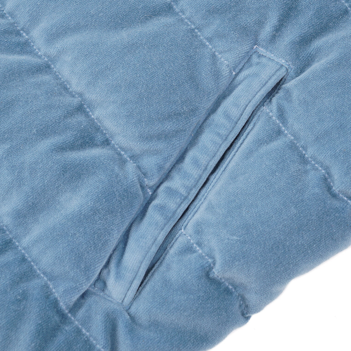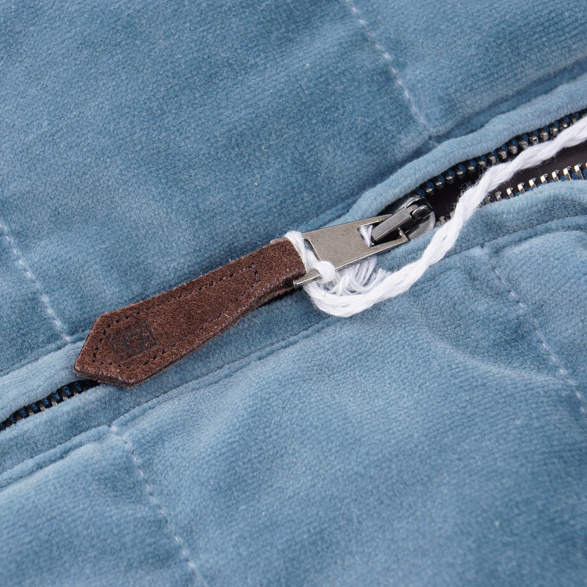 Medium sky blue soft velvet cotton fabric with genuine down fill. 100% cotton. Mid-weight
