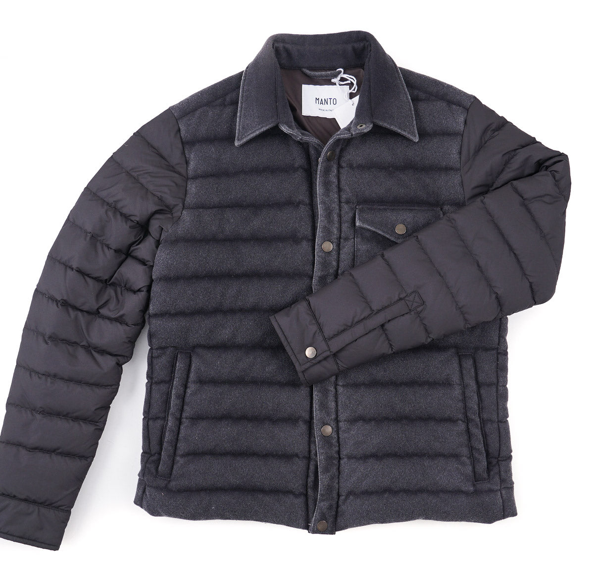 This luxury-casual puffer jacket from Manto is tailored from a soft brushed cashmere fabric with goose down insulation and contrasted with technical fabric sleeves.