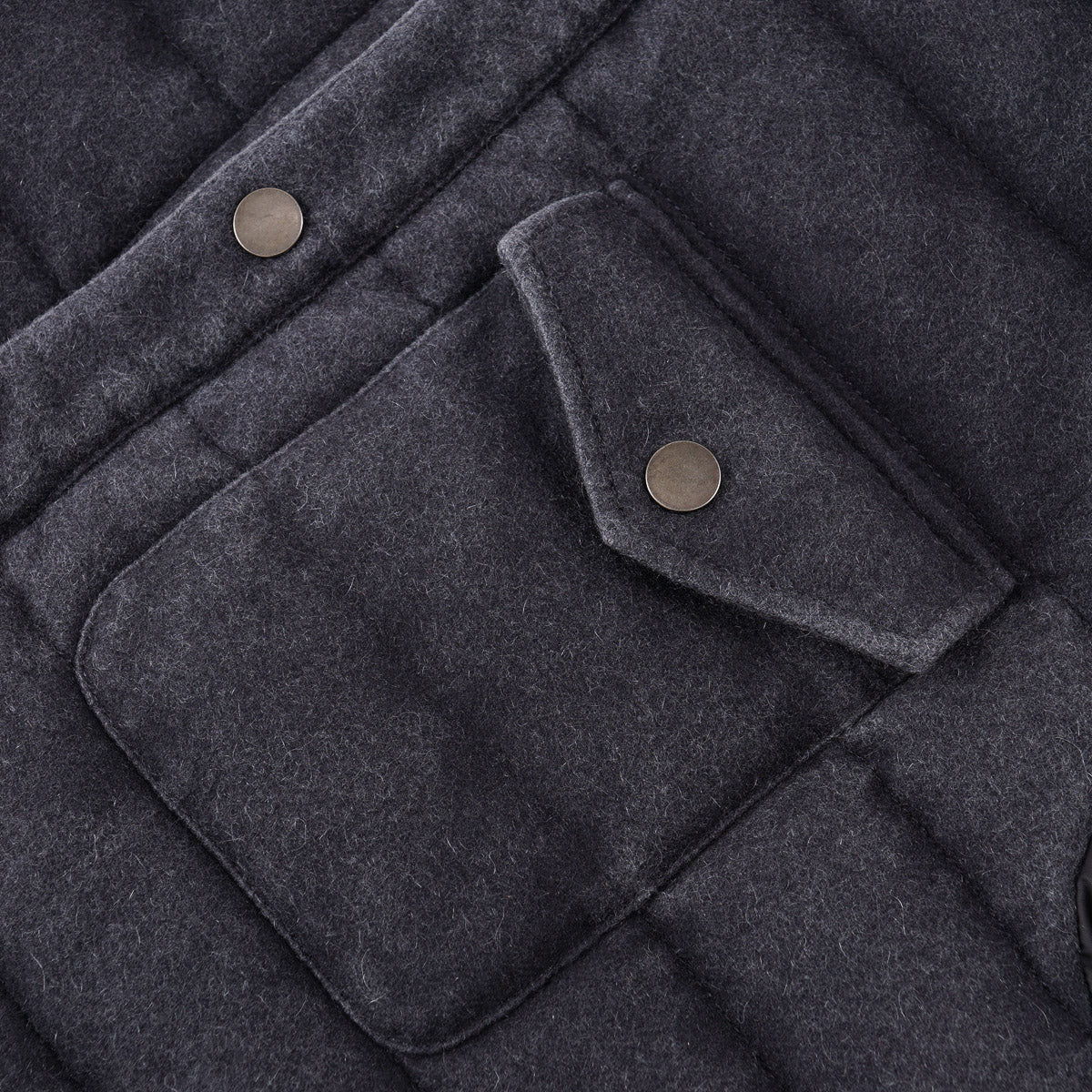 Charcoal black garment-dyed quilted flannel cashmere shell  Contrasting technical fabric sleeves.  Goose down insulation.  100% cashmere body; 100% nylon sleeves.  Fall and winter-weight