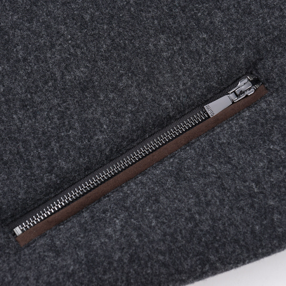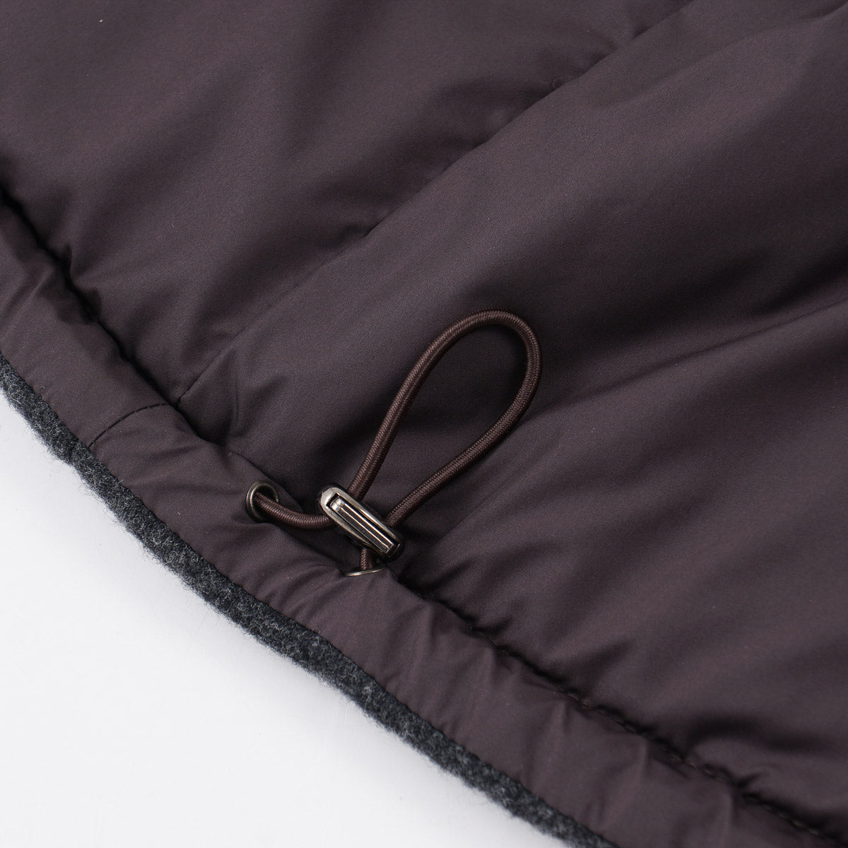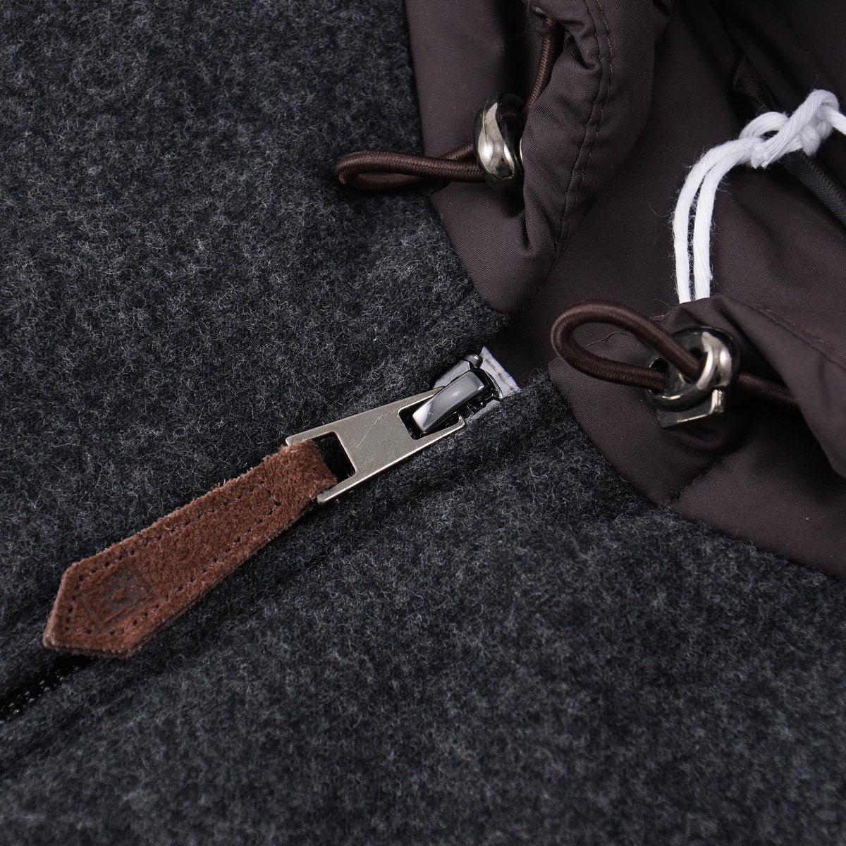 Solid charcoal gray soft-brushed flannel cashmere and wool with lightly insulated fill.  87% wool, 9% cashmere, 4% elastane.  Mid-weight