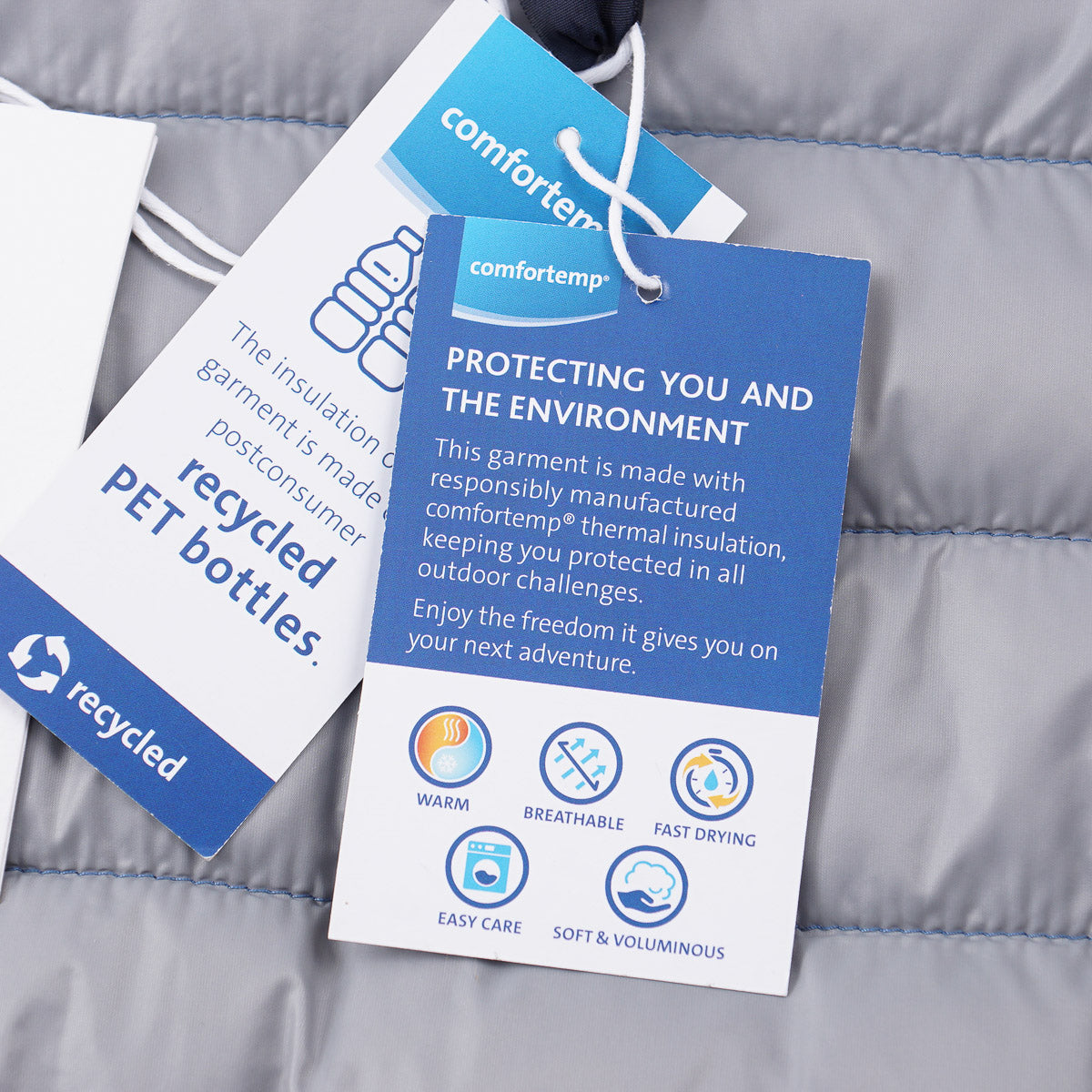 Medium blue quilted technical nylon shell with recycled polyester Ecodown filling. 100% nylon; 100% polyester fill. Lightweight