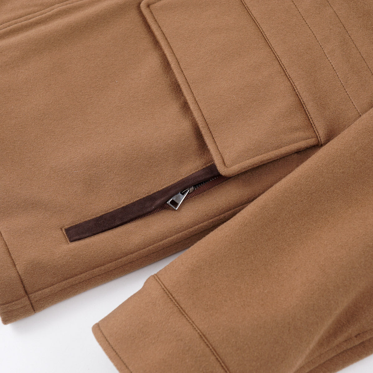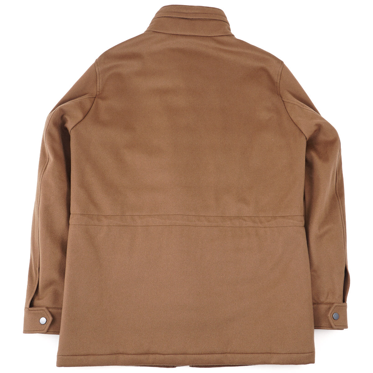 Camel tan Storm System fabric from Loro Piana; contrasting nylon lining with padded insulation.  100% cashmere.  Fall and winter weight
