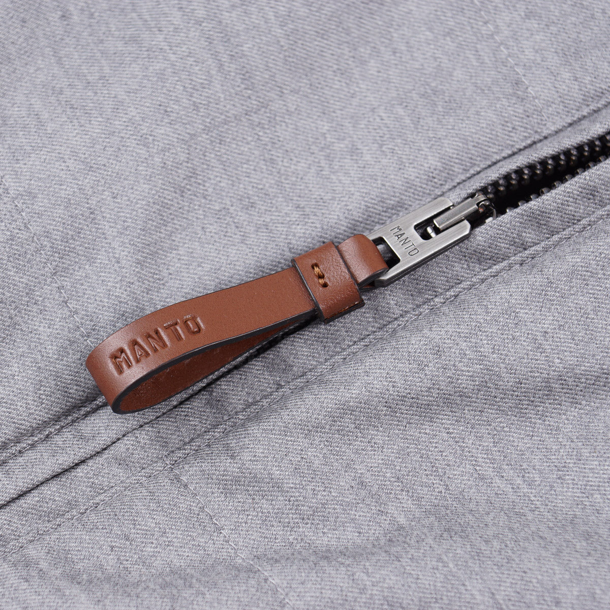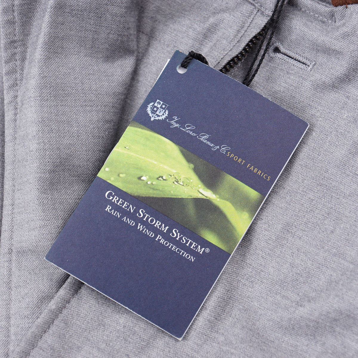 Solid light gray Loro Piana Storm System fabric with suede collar trim detail. Lightly insulated fill. 95% wool, 5% silk. Mid-weight