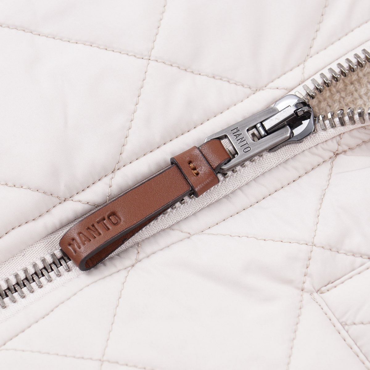 Ivory cream quilted tech fabric front panel with oatmeal beige soft-knit wool blend back. 100% polyester; 55% wool, 30% silk, 15% polyester back. Mid-weight