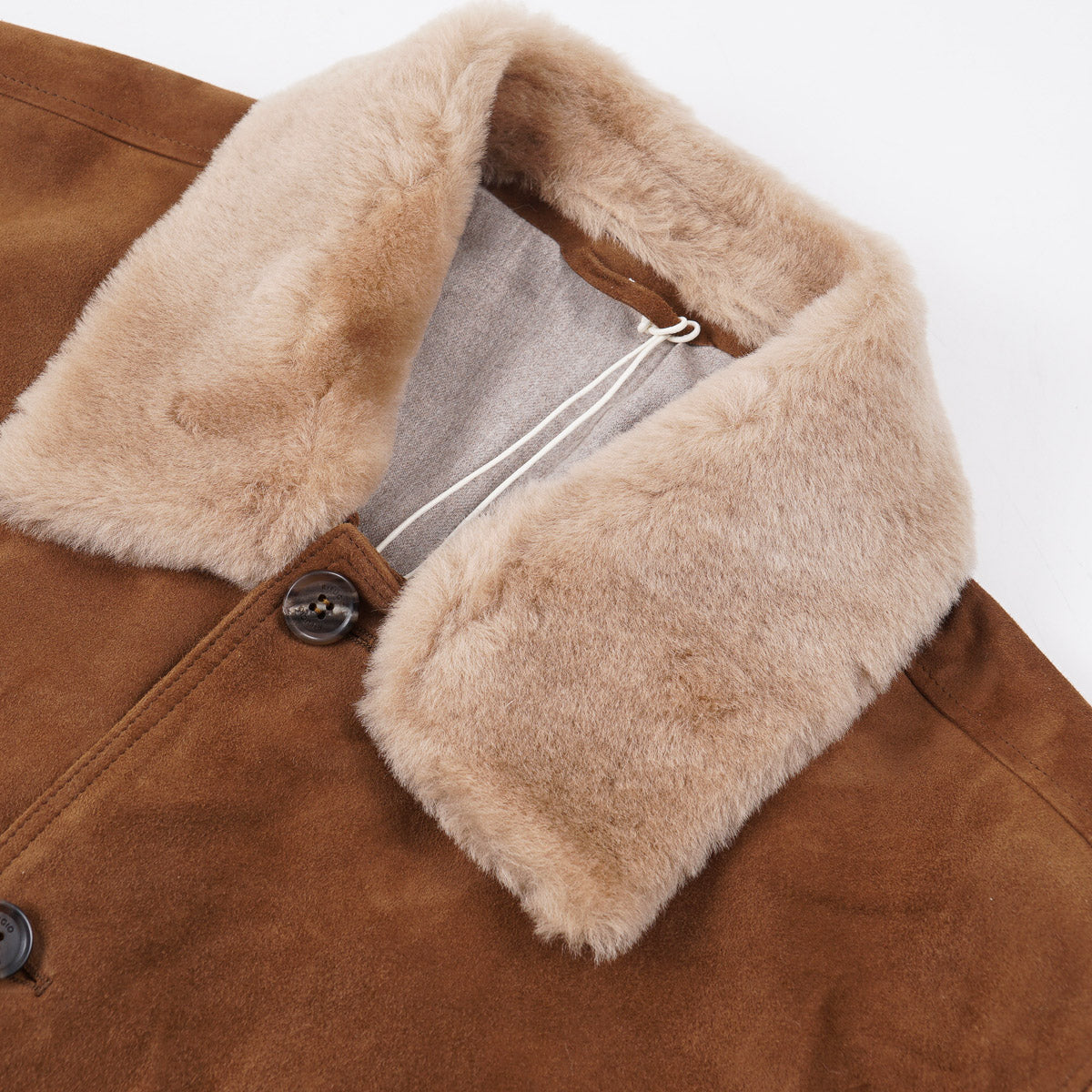 Rich medium brown soft nappa lambskin suede with brushed gray merino wool lining. Detachable sheepskin shearling collar. 100% leather; 100% wool interior. Mid-weight.