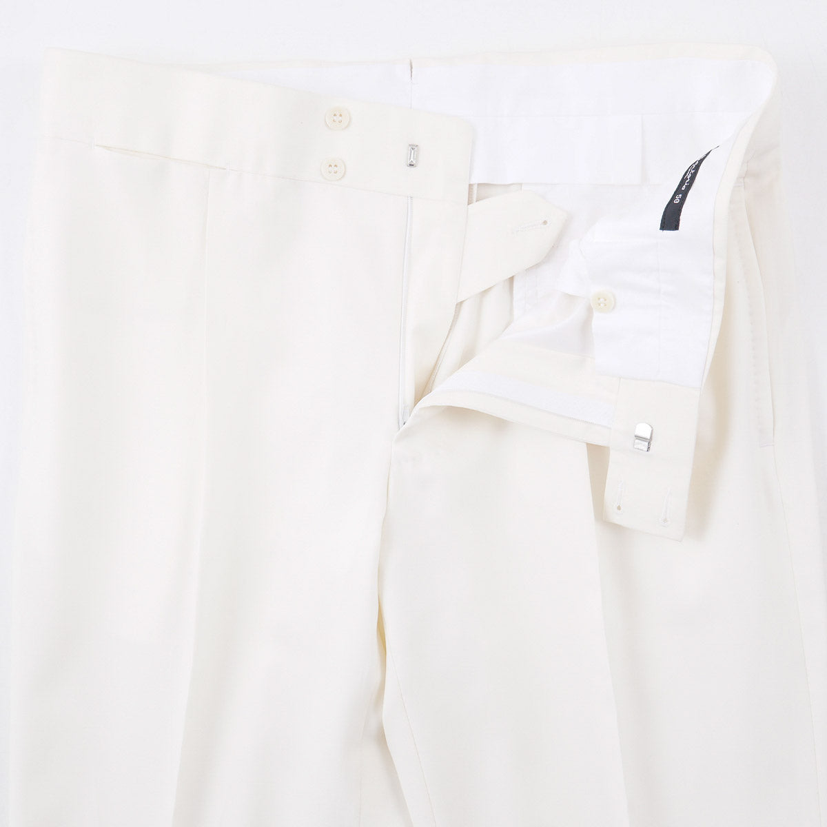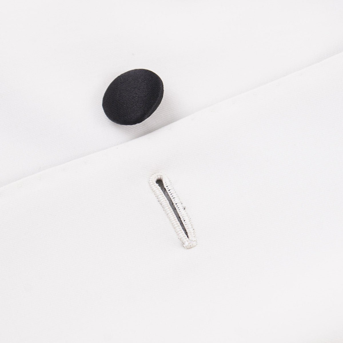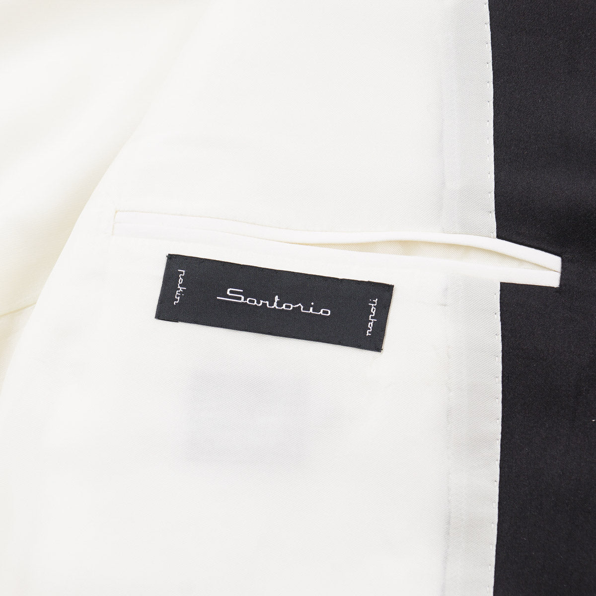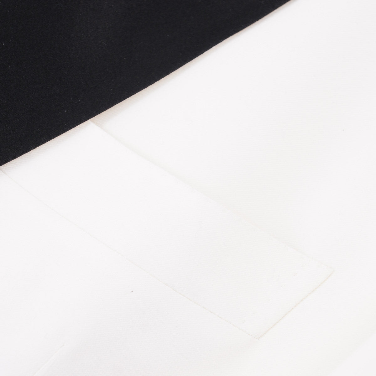 Ivory white extrafine wool fabric with contrasting black satin details. 100% wool. Mid-weight.