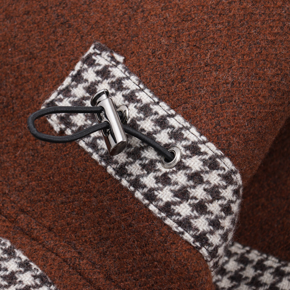Brown and cream soft-woven houndstooth check patterned wool blend fabric. Double-faced, with rust brown on the interior side. Fall and mild winter weight. 94% wool, 6% cashmere.