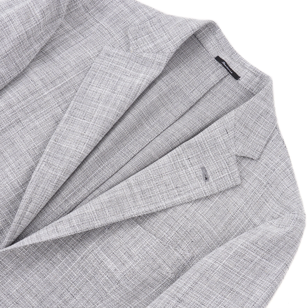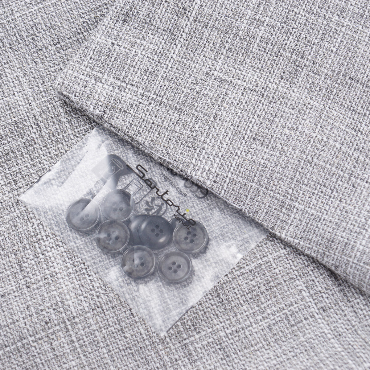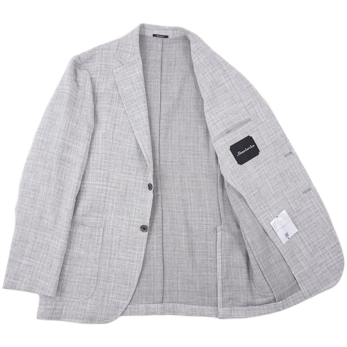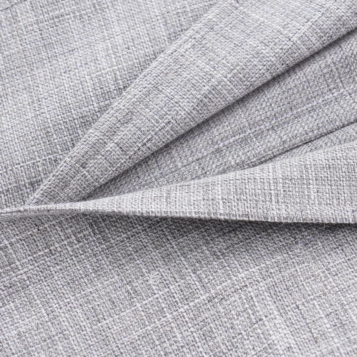 Extrafine wool, linen and cotton blend fabric in a light gray and white subtle-woven mélange pattern. The overall effect is a cream-gray color. 44% wool, 43% cotton, 11% linen, 2% elastane. Mid-light weight.