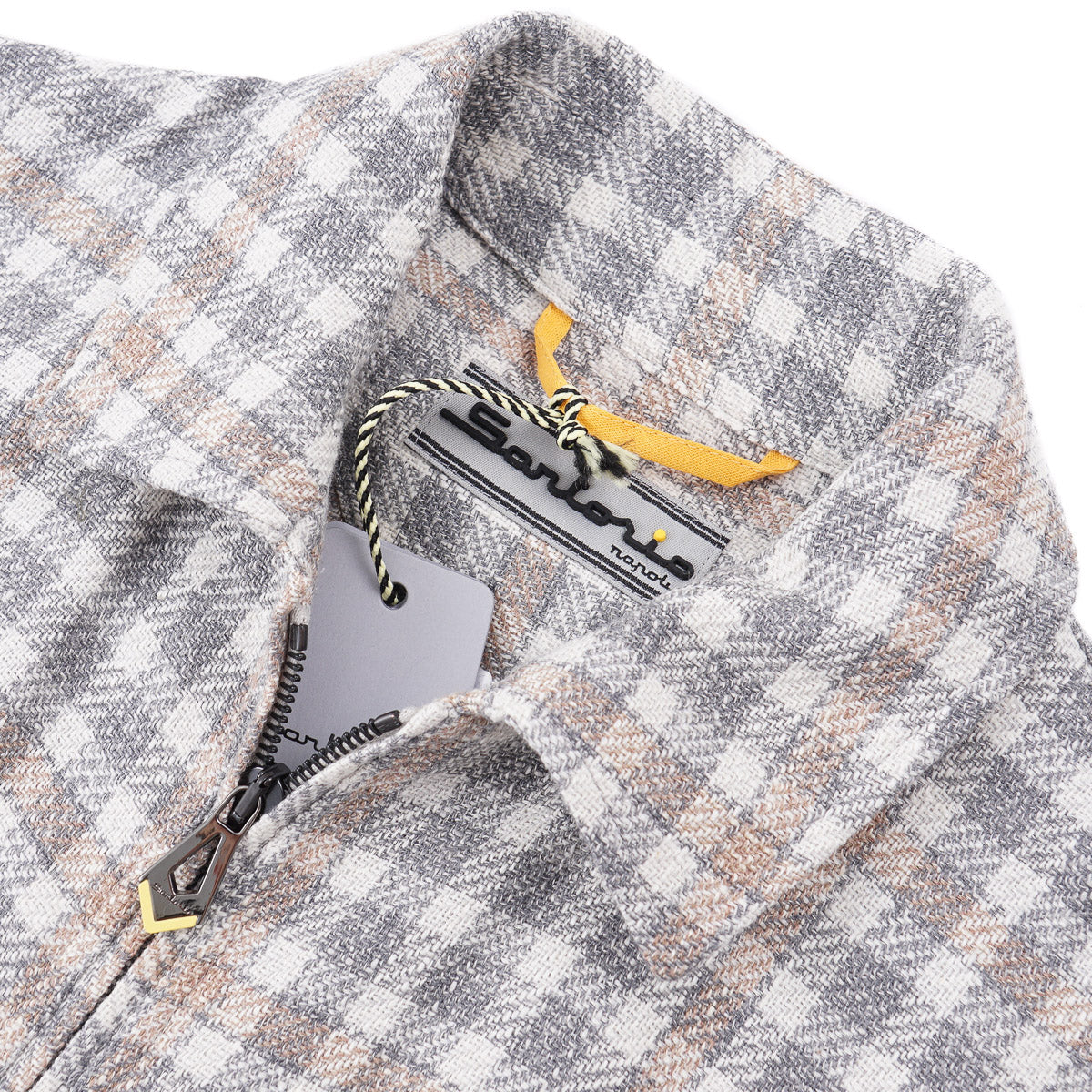 Gray, tan, and white check patterned wool-blend fabric. Mid weight. 52% wool, 22% silk, 13% cotton, 13% nylon.