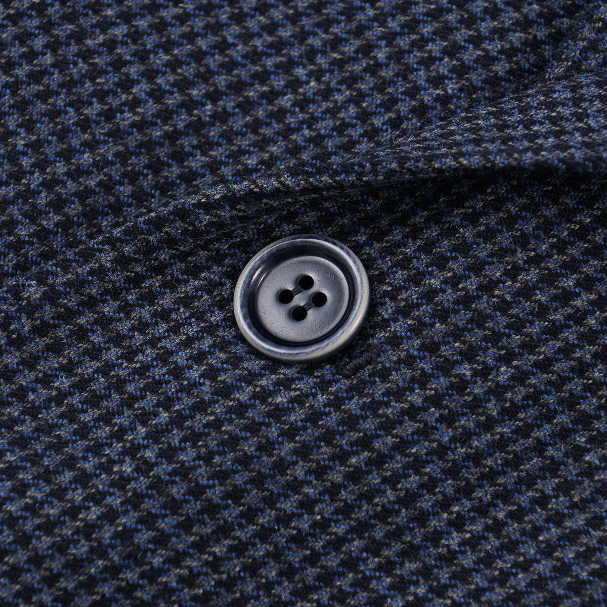 Blue and navy woven houndstooth check patterned lambswool fabric. 100% wool. Fall and winter weight.