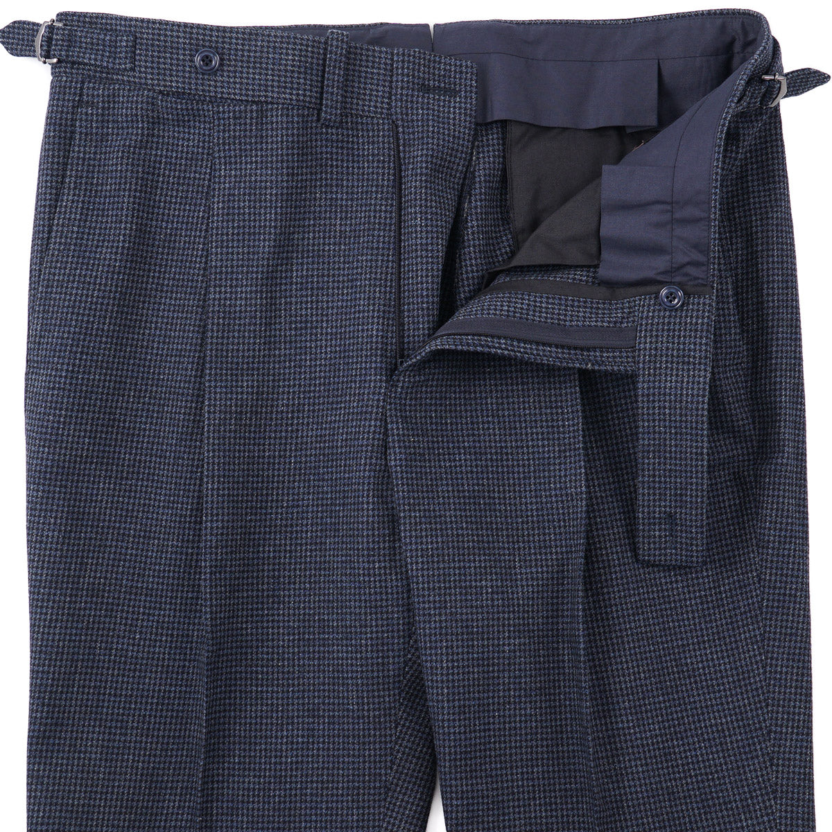 - Single pleat pants with buckled side tabs