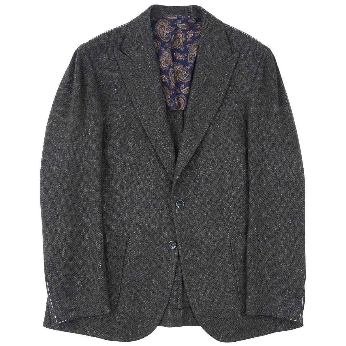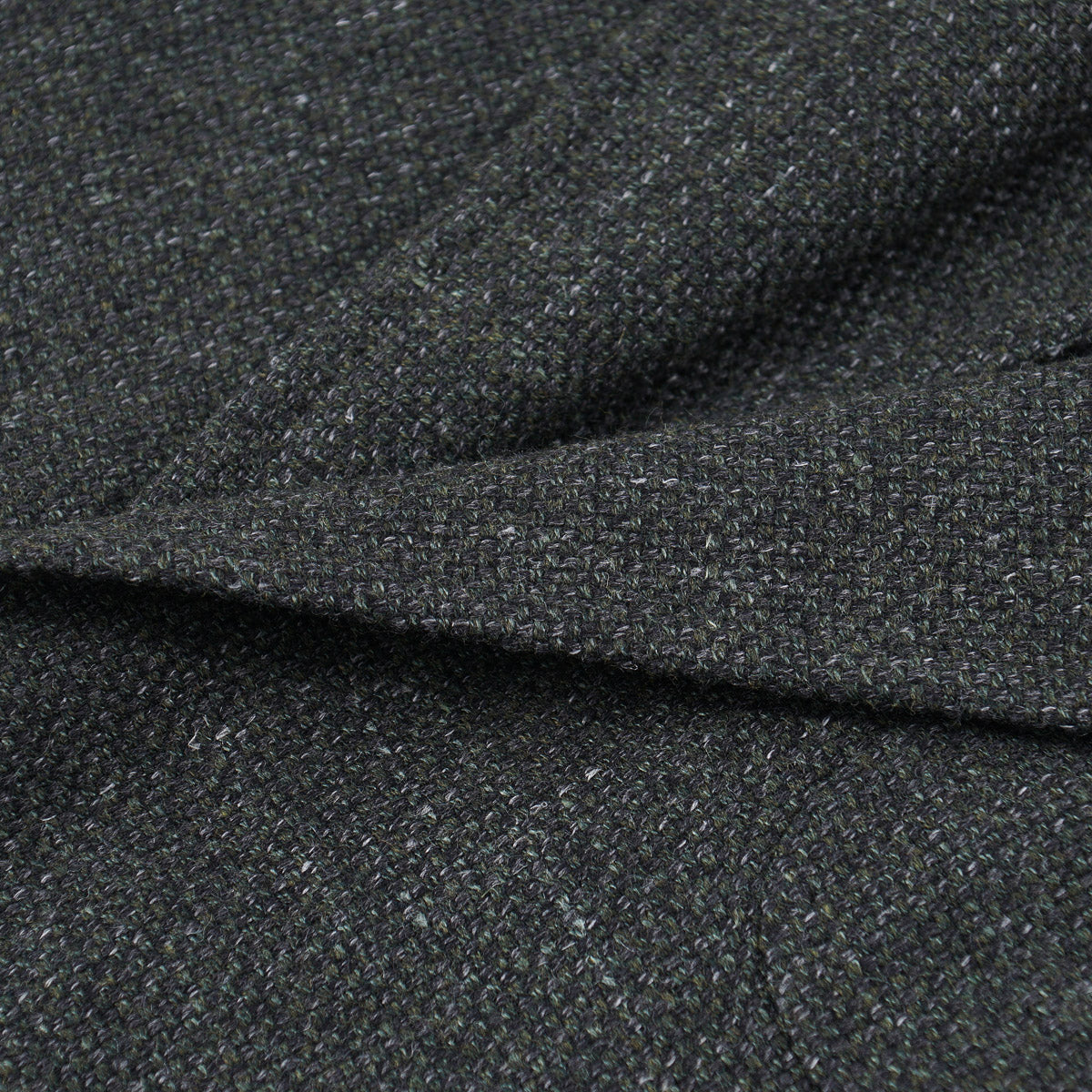 Green and gray mélange wool-blend fabric in a subtle woven pattern.  Contrasting paisley printed lining.  75% wool, 10% silk, 10% linen, 5% cashmere.  Mid-weight.