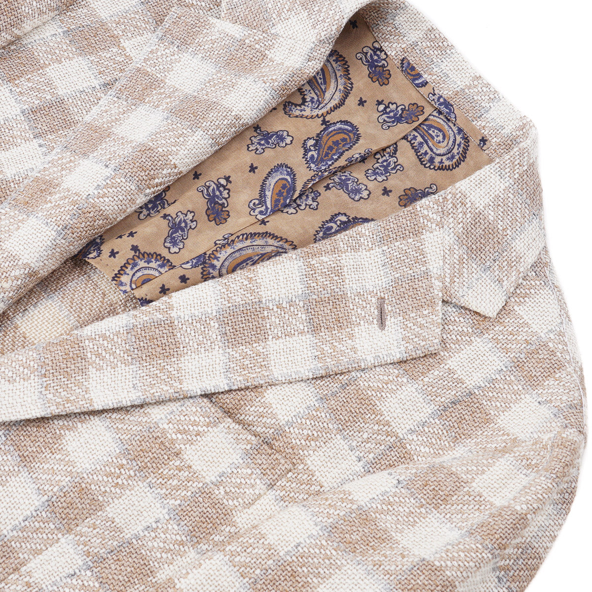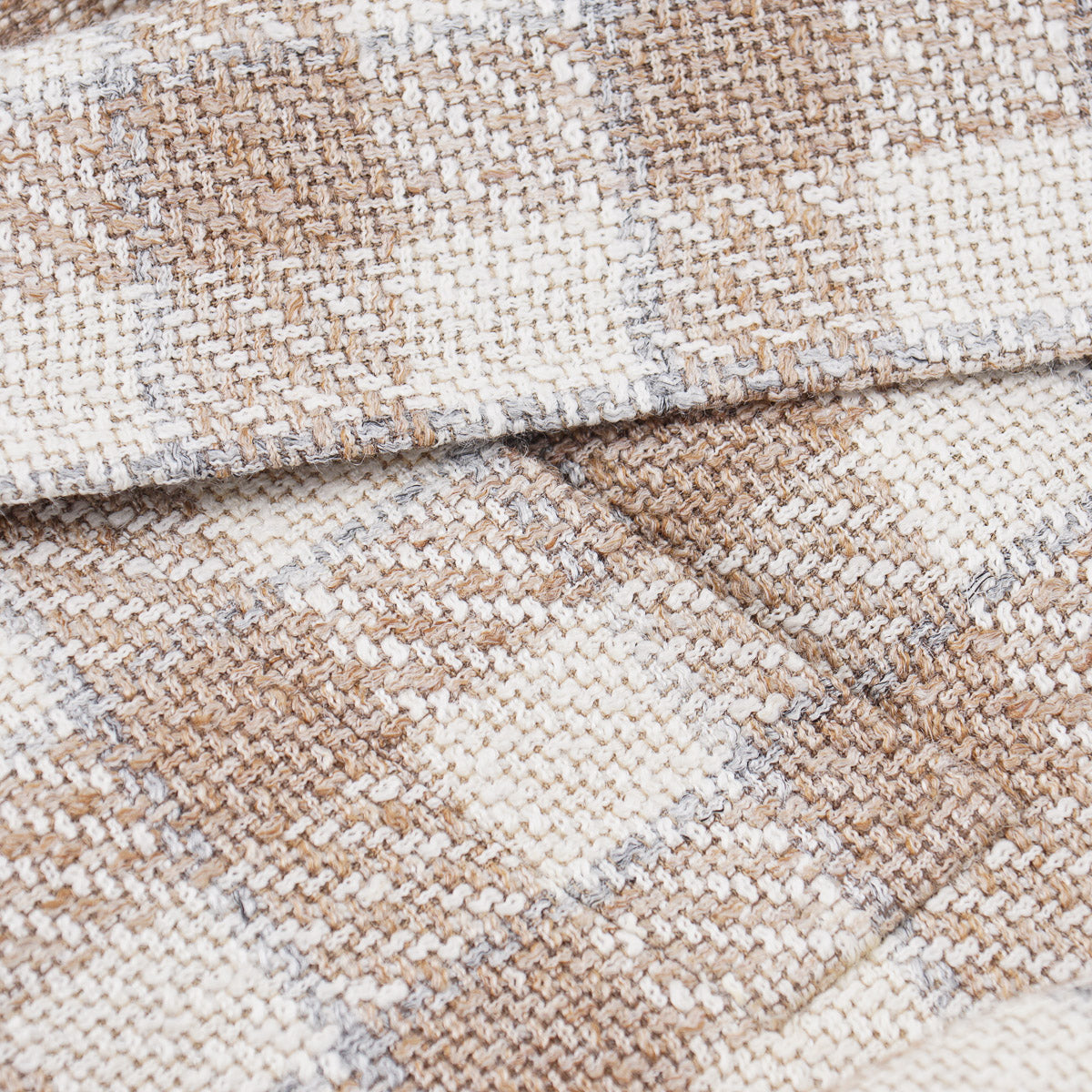 Cream, tan, and light gray check patterned woven linen-blend fabric. 38% silk, 38% linen, 16% cotton, 10% nylon. Mid-weight.
