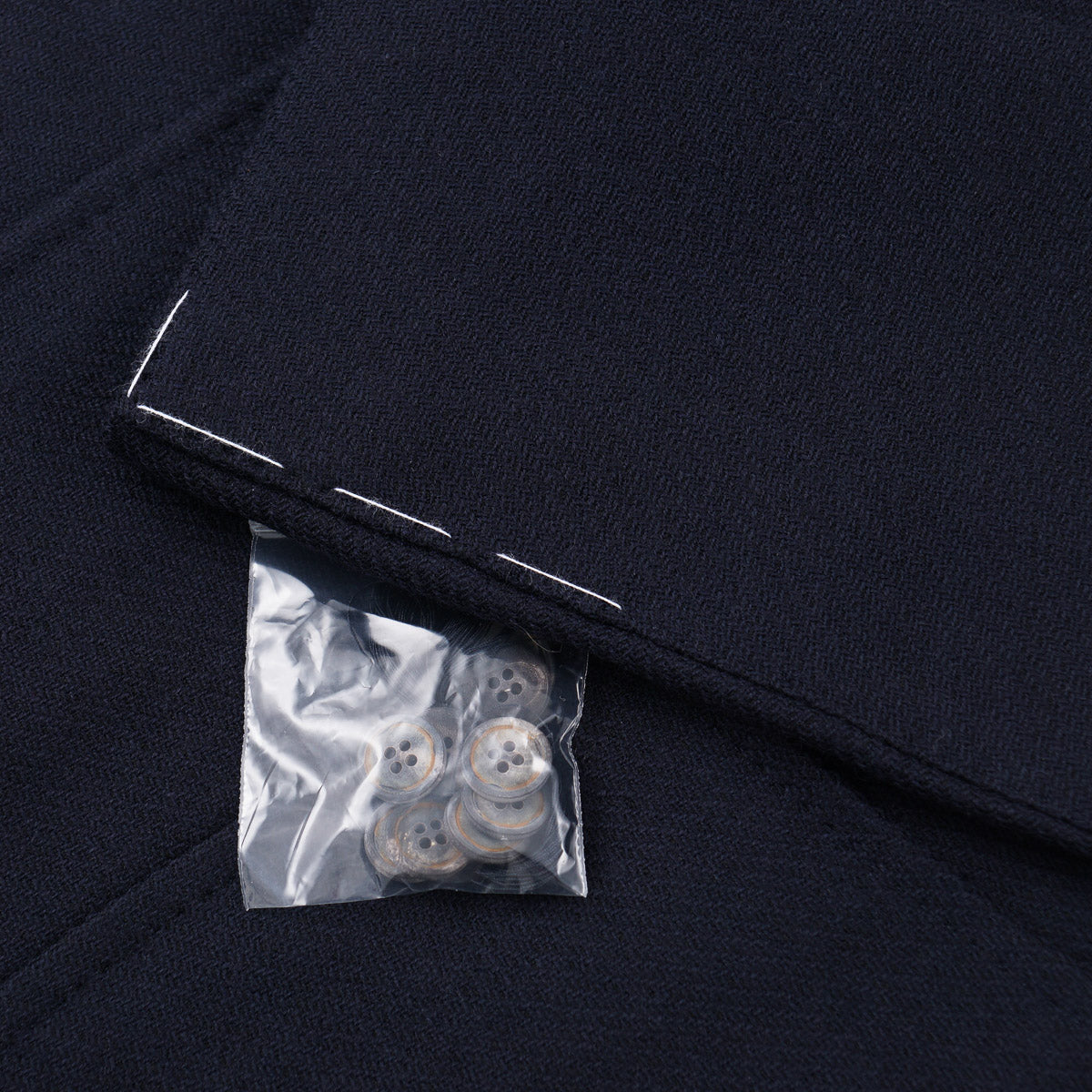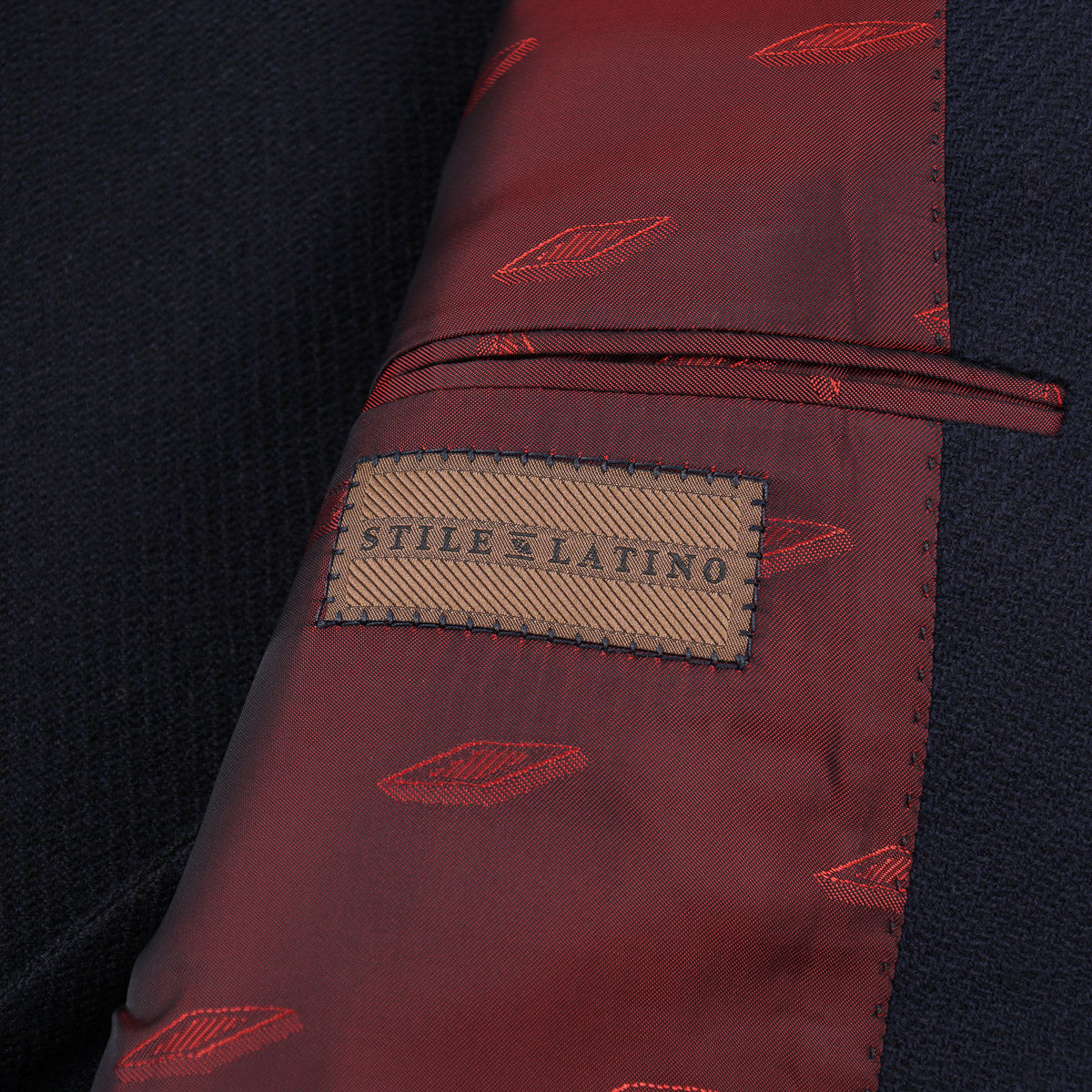 Navy blue subtle woven patterned wool fabric with contrasting burgundy lining. 100% wool. Mid-weight.